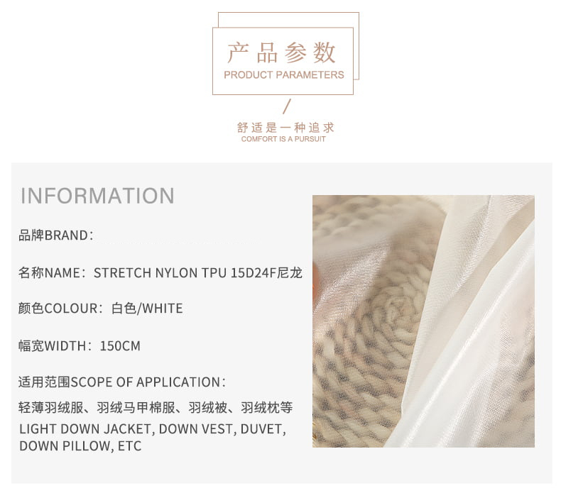 | 07 | ID640987060640 | ND-380T | N380 DOWNBAG | WHITE | 100%NYLON | 380T | 20D*20D 24F*24F | 57"-58" 150~153CM | 50GSM | CIRE |